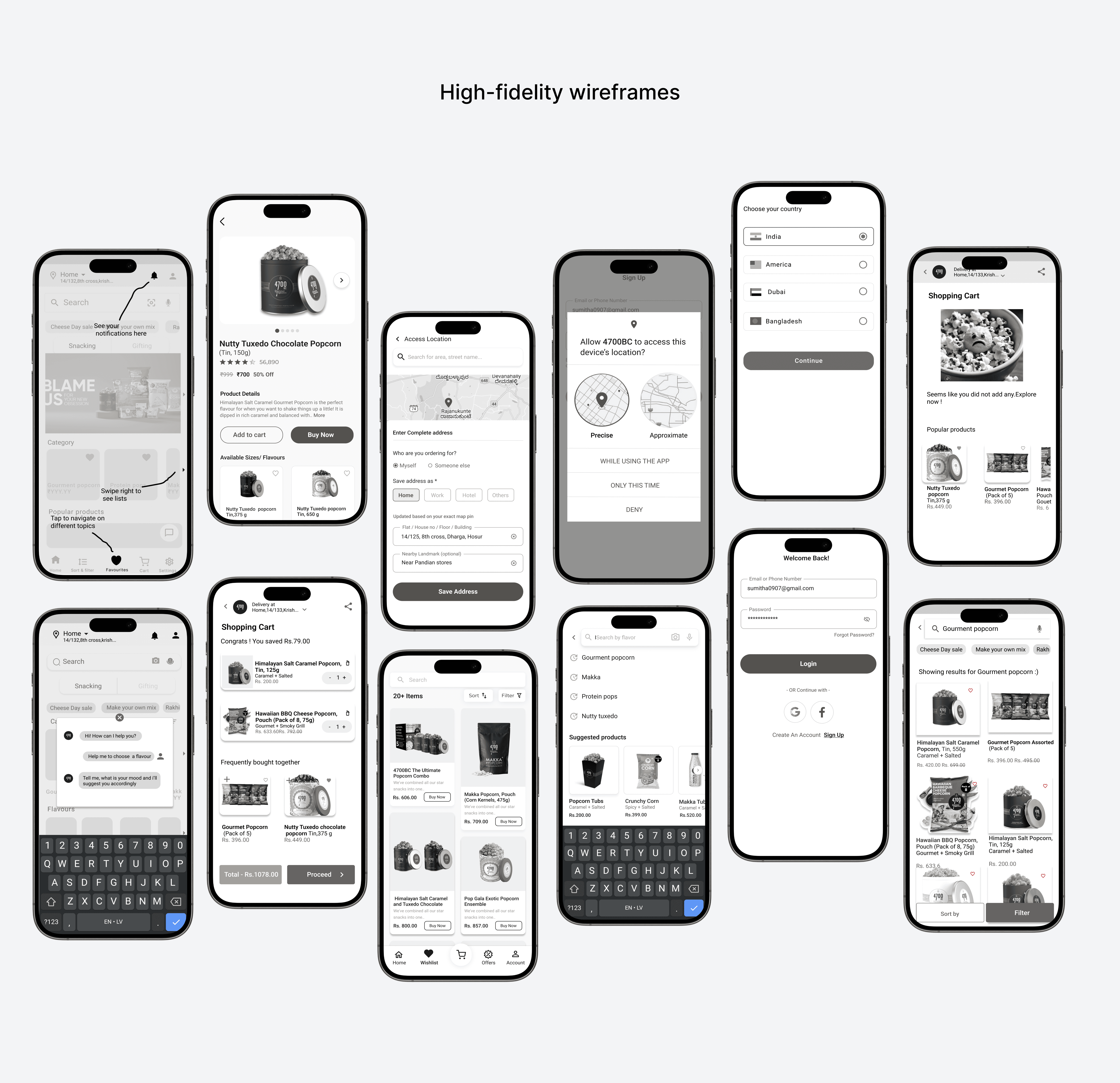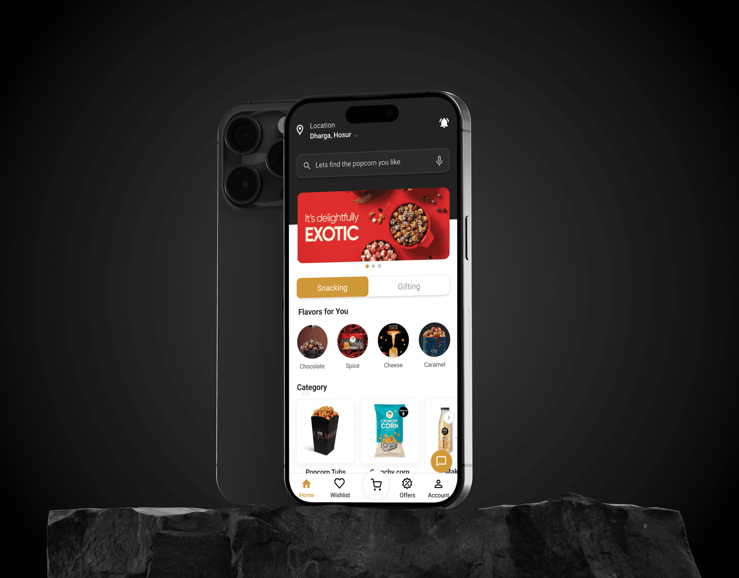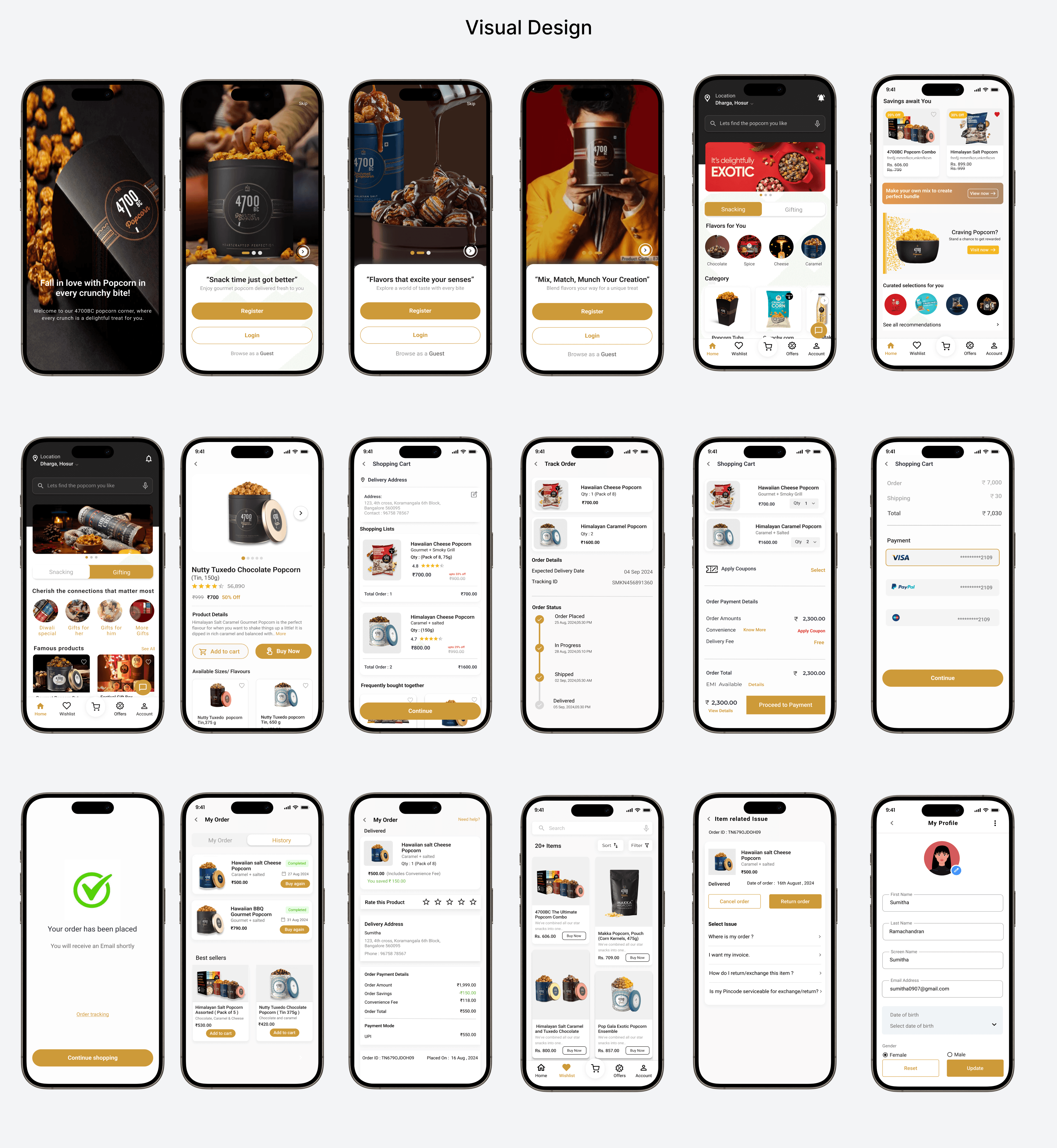 With a user-centered approach, the goal was to create a mobile app that elevates snacking by enabling users to explore and purchase premium popcorn and snacks.